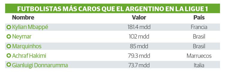 Esta actualización de Transfermarkt coloca al sudamericano en el puesto 49 de los futbolistas mejor tasados del orbe y el sexto en la Ligue 1 y en el PSG, además de que es el segundo seleccionado de Argentina con más valor, pero el cuarto extremo derecho mejor cotizado del planeta.
