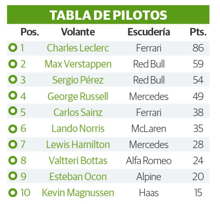 El monegasco Charles Leclerc (Ferrari) estuvo a la caza de Checo Pérez durante toda la competencia, pero en la vuelta 54 hizo un trompo y se estrelló, lo que lo llevó a pits para cambiar la trompa de su monoplaza y ahí perdió el tercer puesto.