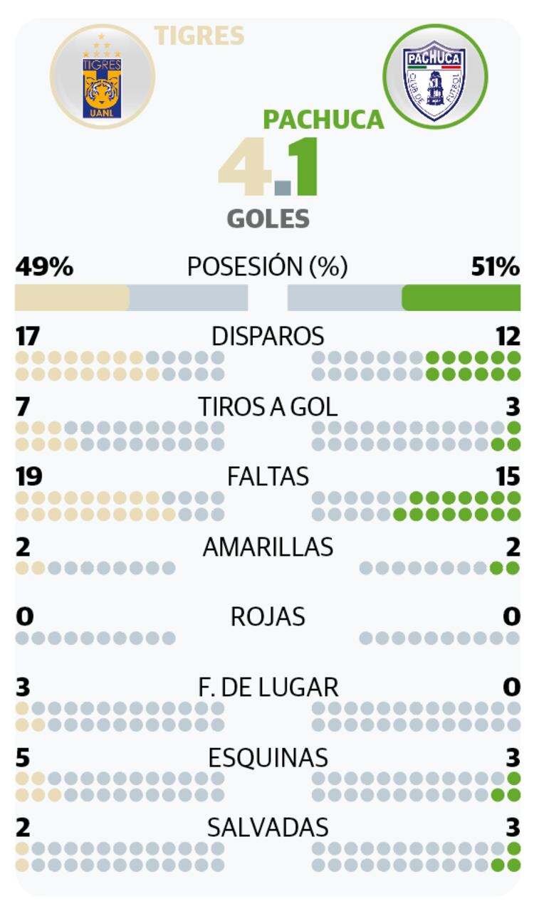 Los tantos del partido fueron obra de “Chofis” López (9'), por parte de los hidalguenses y de Fernando Gorriarán (32'), André-Pierre Gignac (55') y Luis Quiñones (80', 87') por los de la UANL.