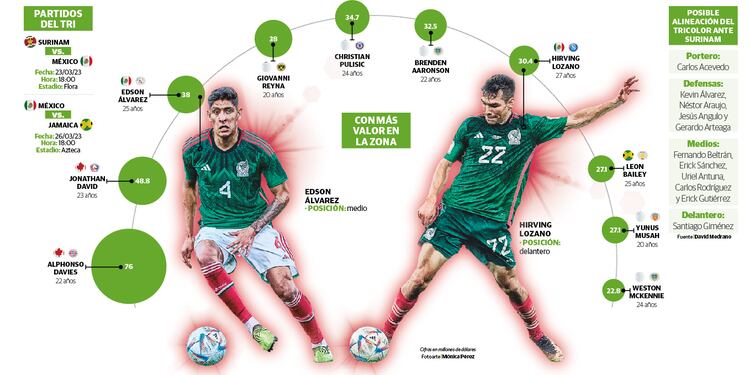México enfrentará a las selecciones de Concacaf, pero actualmente no se podría decir que sigue siendo una potencia regional, pues Estados Unidos y Canadá se han visto en la necesidad de mejorar y sus jugadores son la clara imagen, pues por parte del Tricolor solamente figuran en el top 10, de mejor valuados en el mercado, Edson Álvarez e Hirving Lozano; el primero con un costo de 37.7 millones de dólares y el segundo 30.2 mdd.