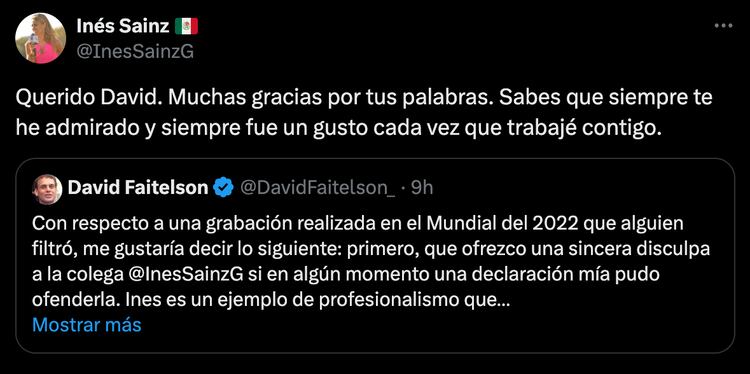 "Querido David. Muchas gracias por tus palabras. Sabes que siempre te he admirado y siempre fue un gusto cada vez que trabajé contigo", fue la asombrosa y breve respuesta de Inés Sainz a David Faitelson.