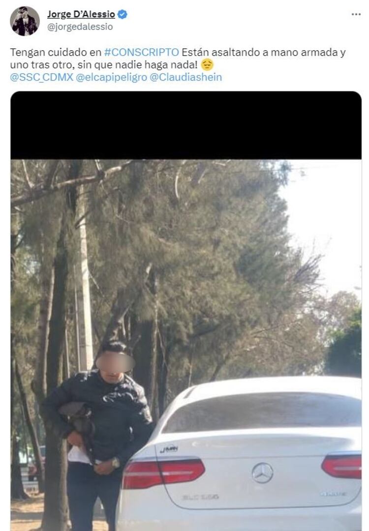 “Tengan cuidado en Conscripto están asaltando a mano armada y uno tras otro, sin que nadie haga nada”, publicó desde su cuenta de Twitter @jorgedalessio.