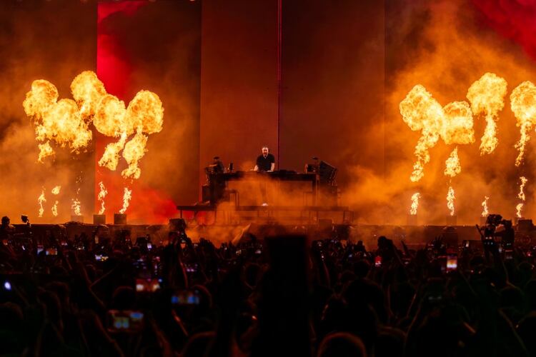 Los números se complementaron con llamaradas de fuego que salían desde el escenario, así como con un juego de visuales que se acoplaba perfectamente al set que presentó el DJ.