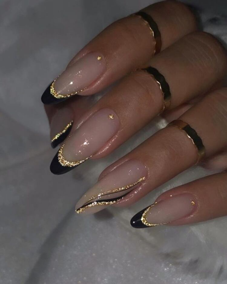 Si deseas incluir algo más en tu diseño de uñas de color negro con brillos, puedes realizar un francés alterado y agregar lineas en dorado. De igual manera, puedes jugar con las lineas al crear formas delicadas y sencillas que lucirán muy elegantes.