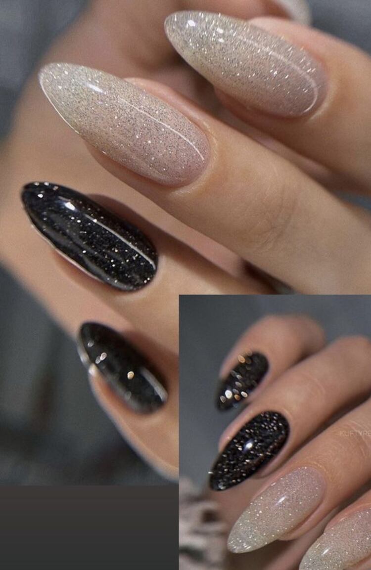 Puedes combinar los brillitos a full en las uñas al mezclar blanco con negro. Elige un par para que sean de dichos colores y el resultado será hermoso.