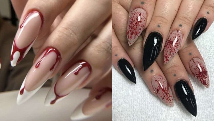 Si eres amante del género slasher y el gore, lucir uñas ensangrentadas es perfecto para ti. Puedes adornar un francés sencillo con un rojo que brote de cada línea en tus uñas u optar por el estilo de los asesinos al lucir el rojo salpicado.