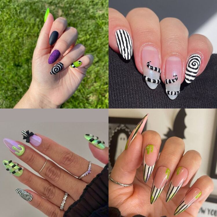 No cabe duda que Beetlejuice es una de las películas de 'terror' más esperadas del año. La cinta cómica de Tim Burton con toques fantasmagóricos conquistó al mundo con su segunda entrega y por ello, las uñas que hagan referencia a los colores del personaje son un must have. ¡Hay tantas formas de hacerlo!
