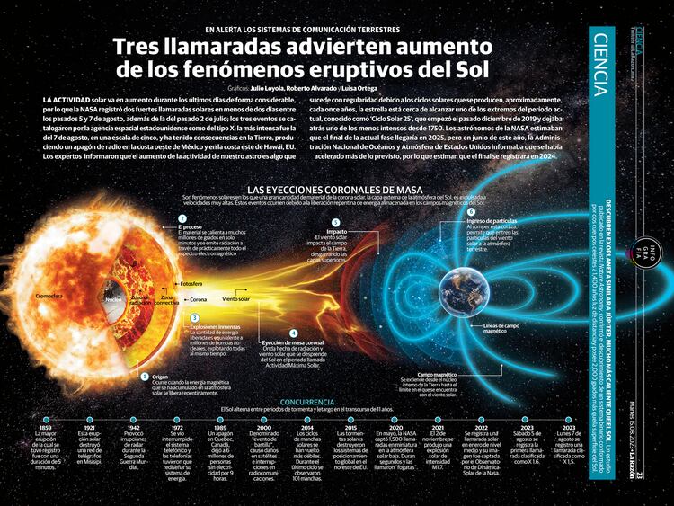 La actividad solar va en aumento durante los últimos días de forma considerable, por lo que la NASA registró dos fuertes llamaradas solares en menos de dos días entre los pasados 5 y 7 de agosto, además de la del pasado 2 de julio; los tres eventos se catalogaron por la agencia espacial estadounidense como del tipo X, la más intensa fue la del 7 de agosto, en una escala de cinco, y ha tenido consecuencias en la Tierra, produciendo un apagón de radio en la costa oeste de México y en la costa este de Hawái, EU. Los expertos informaron que el aumento de la actividad de nuestro astro es algo que sucede con regularidad debido a los ciclos solares que se producen, aproximadamente, cada once años, la estrella está cerca de alcanzar uno de los extremos del período actual, conocido como ‘Ciclo Solar 25’, que empezó el pasado diciembre de 2019 y dejaba atrás uno de los menos intensos desde 1750. Los astrónomos de la NASA estimaban que el final de la actual fase llegaría en 2025, pero en junio de este año, la Administración Nacional de Océanos y Atmósfera de Estados Unidos informaba que se había acelerado más de lo previsto, por lo que estiman que el final se registrará en 2024.