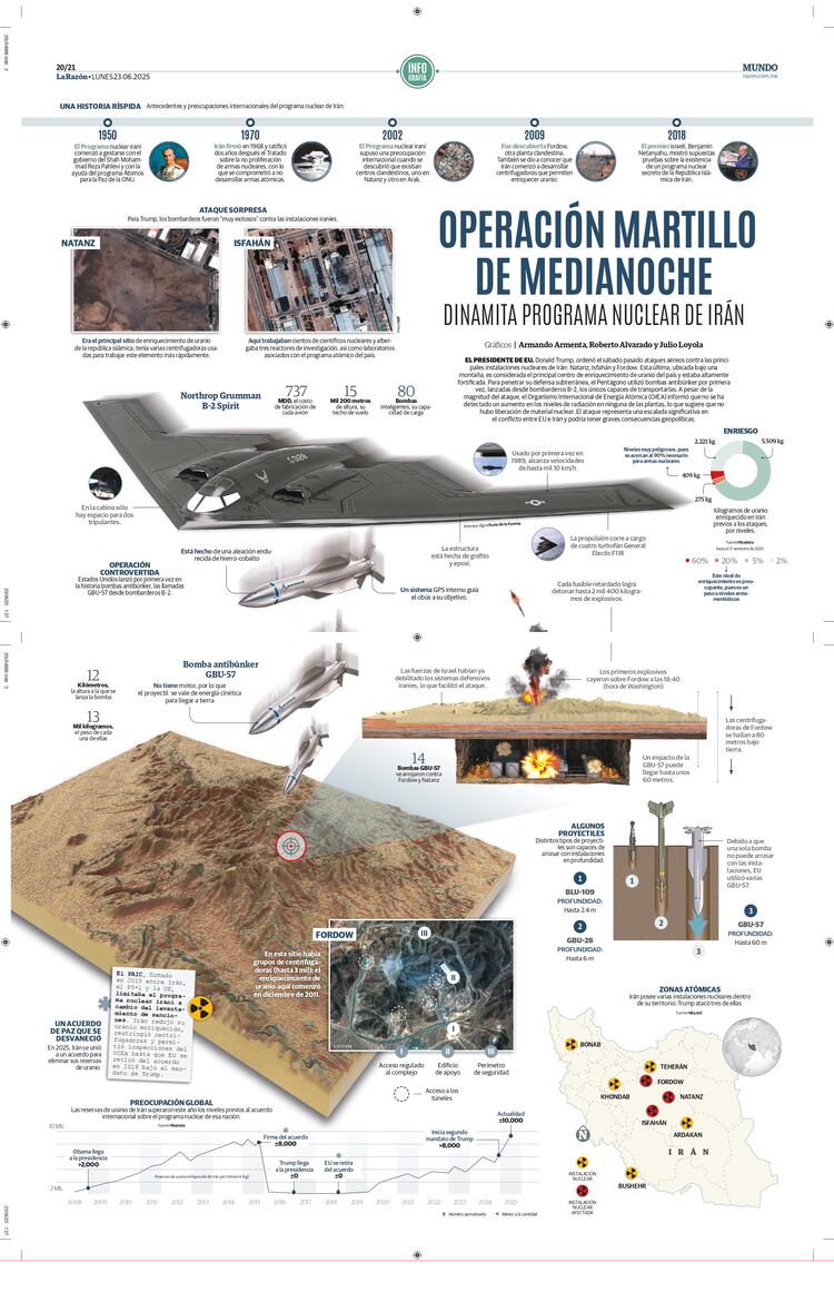 El presidente de EU, Donald Trump, ordenó el sábado pasado ataques aéreos contra las principales instalaciones nucleares de Irán: Natanz, Isfahán y Fordow. Esta última, ubicada bajo una montaña, es considerada el principal centro de enriquecimiento de uranio del país y estaba altamente fortificada. Para penetrar su defensa subterránea, el Pentágono utilizó bombas antibúnker por primera vez, lanzadas desde bombarderos B-2, los únicos capaces de transportarlas. A pesar de la magnitud del ataque, el Organismo Internacional de Energía Atómica (OIEA) informó que no se ha detectado un aumento en los niveles de radiación en ninguna de las plantas, lo que sugiere que no hubo liberación de material nuclear. El ataque representa una escalada significativa en el conflicto entre EU e Irán y podría tener graves consecuencias geopolíticas.