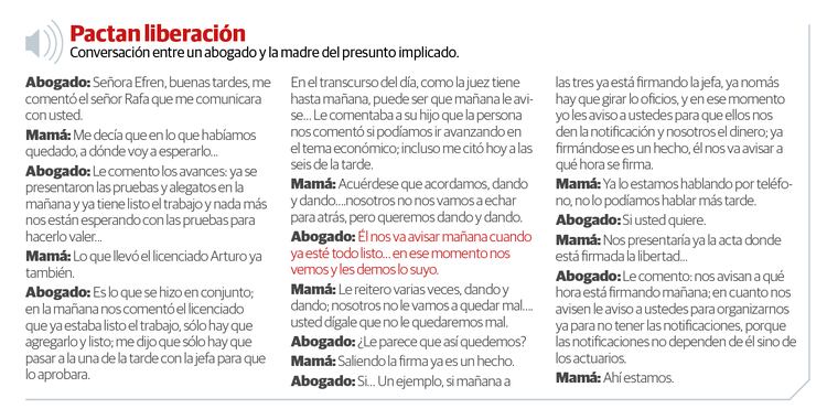 La señora insiste en que cuestionar “¿si es verdad?” la liberación de su hijo, a lo que el hombre responde que sí, “ya nada más falta que lo firme la jefa”, pues el asunto está en revisión. Finalmente, acuerdan comunicarse al día siguiente para culminar la transacción.