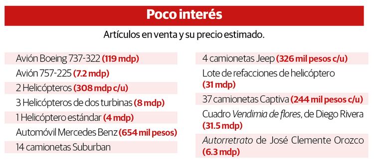 Un automóvil de lujo Mercedes Benz, 18 camionetas, seis helicópteros, dos aviones y partes de aeronaves son parte de los artículos que supuestamente serían subastados desde el año pasado; sin embargo, La Razón detectó que estas 28 propiedades, con un valor estimado de más de 701 millones de pesos, siguen en el inventario de la Presidencia de la República que encabeza Andrés Manuel López Obrador.
