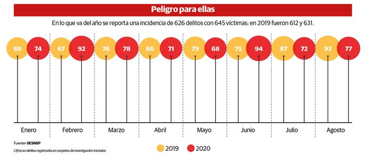 A pesar del confinamiento provocado por la pandemia de Covid-19 el feminicidio sigue al alza. En los primeros ocho meses de 2020 hubo un incremento de 2.3 por ciento en comparación con el mismo periodo del año anterior al pasar de 612 a 626; esta situación, alertan activistas se da porque no sólo los delitos no se investigan con perspectiva de género, sino que cada entidad tiene su propio método y fallan los protocolos.