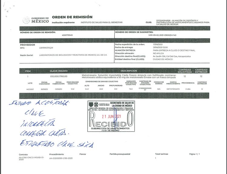 Con un año de rezago, el Instituto de Salud para el Bienestar (Insabi) comenzó el reparto de los medicamentos oncológicos adquiridos en 2020 a través de Laboratorios y Reactivos de México S.A de C.V (Birmex), de acuerdo con documentos entregados a los padres de niños con cáncer.