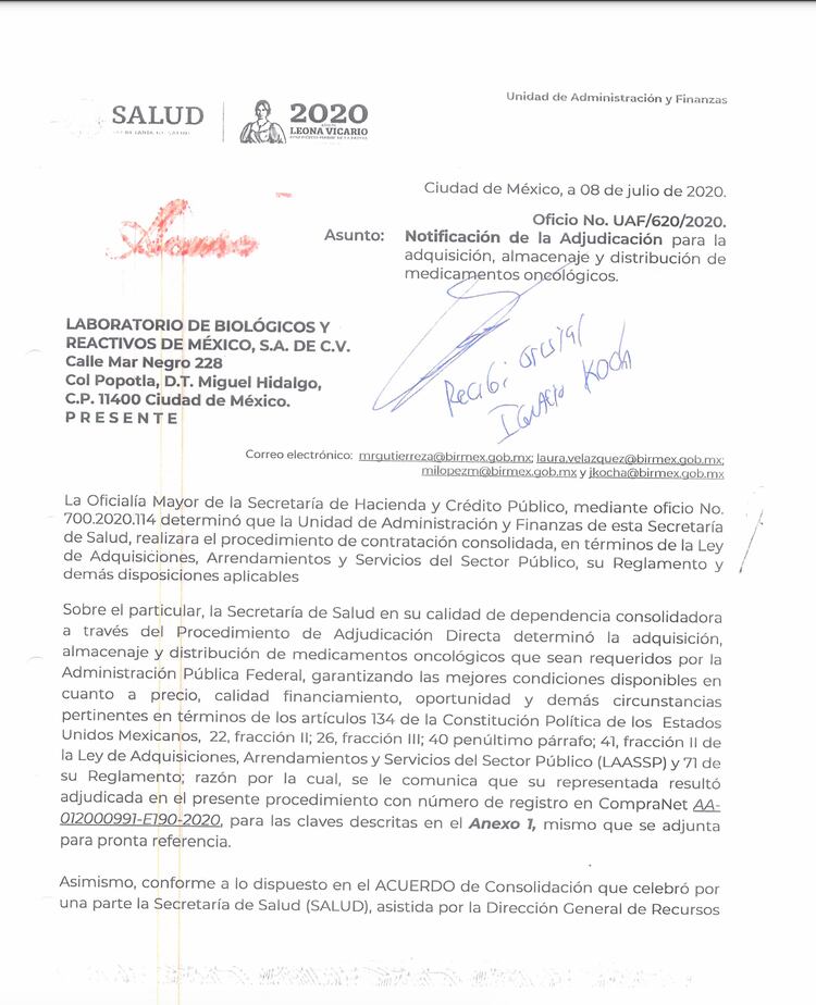 Además, el 8 de julio de 2020, la Oficialía Mayor de Hacienda informó a Birmex que había sido ganador de esas adjudicaciones directas, para encargarse de la adquisición, almacenaje y distribución de medicamentos oncológicos.