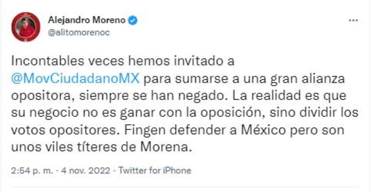 En uno de sus mensajes de su cuenta de Twitter, Moreno Cárdenas advirtió: “Incontables veces hemos invitado a @MovCiudadanoMX para sumarse a una gran alianza opositora, siempre se han negado. La realidad es que su negocio no es ganar con la oposición, sino dividir los votos opositores. Fingen defender a México pero son unos viles títeres de Morena”.