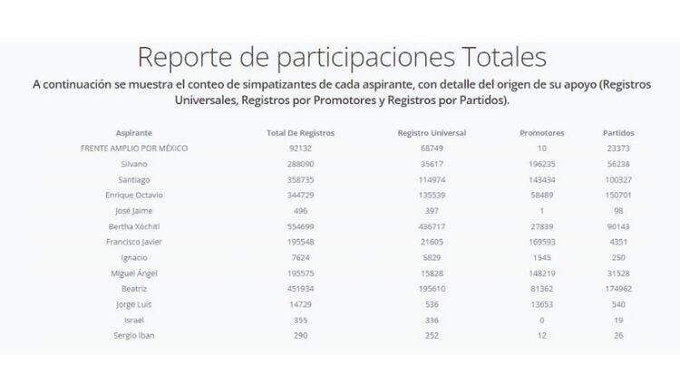Beatriz Paredes con 451 mil 934; Santiago Creel 358 mil 735; Enrique de la Madrid, 344 mil 729; mientras que el exgobernador de Michoacán, Silvano Aureoles, 288 mil; el también perredista, Miguel Ángel Mancera, 195 mil 575 y el exmandatario de Tamaulipas, Francisco García Cabeza de Vaca 195 mil 548.