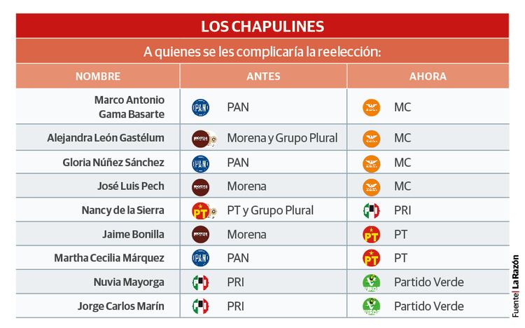 El grupo parlamentario de MC es uno de los que ha recibido más “chapulines”, con seis, pero a los que se les complicaría la reelección son a Marco Antonio Gama Basarte, que pertenecía al PAN; Alejandra León Gastélum, que antes estuvo en Morena y el Grupo Plural; Gloria Núñez Sánchez, también expanista, y el mismo José Luis Pech, que dejó el guinda.
