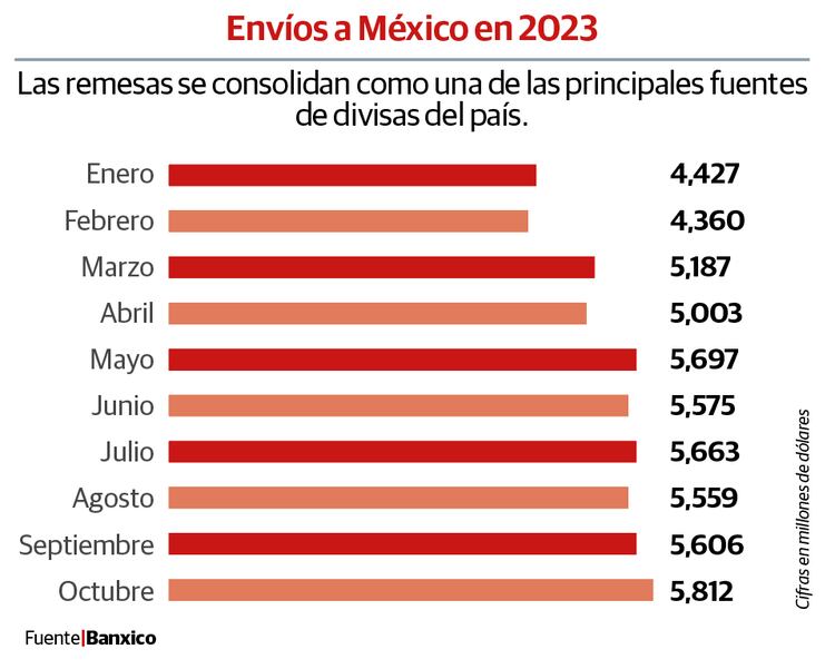 En los últimos 12 meses (de noviembre 2022 a octubre 2023), el flujo acumulado de los ingresos por remesas fue de 63 mil 059 millones de dólares, superando por séptimo mes la barrera de 60 mil millones de dólares y superan el monto total registrado durante el año pasado, de 58 mil 497 millones de dólares.
