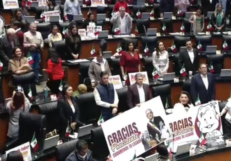 También, con la ausencia de la oposición, el bloque de la Cuarta Transformación en la Cámara baja entonó el cántico de “¡Sí se pudo! ¡Sí se pudo!”, luego de que se cantara la declaración de constitucionalidad.