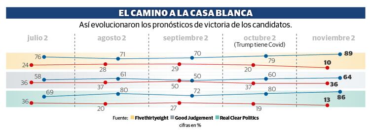 Al cierre de estas campañas, Biden lidera la mayoría de encuestas a nivel nacional y estatal, un factor que dejaba tranquilos sus seguidores, a medida que se acercaban a la línea de meta.