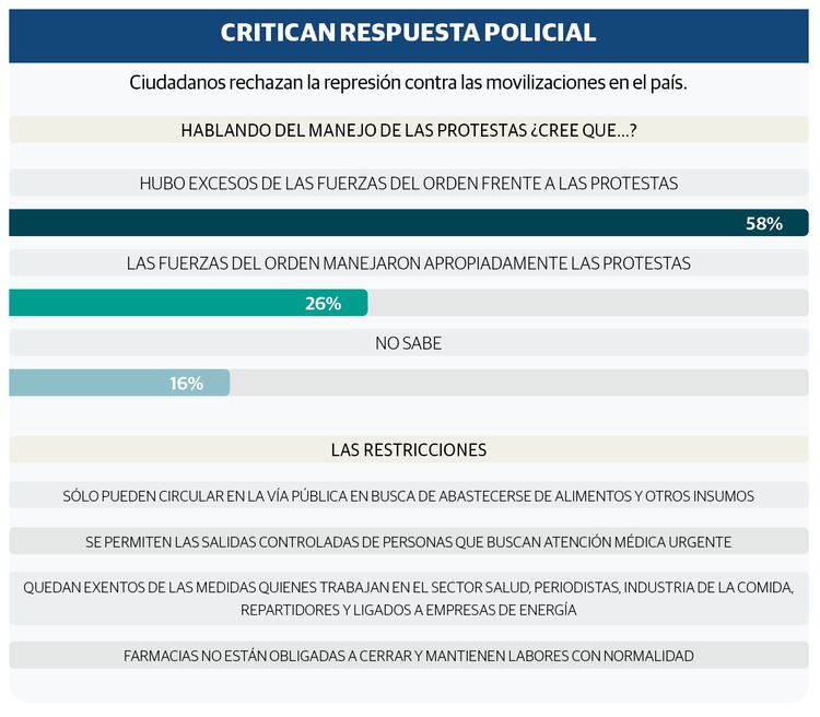 Dicho informe también expone que más de la mitad de la población pugna porque se adelanten las elecciones y hasta 60 por ciento respalda las protestas o se siente identificado con éstas, pues reconoce el reclamo social para atajar la crisis nacional.