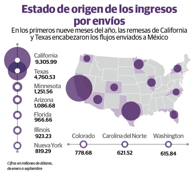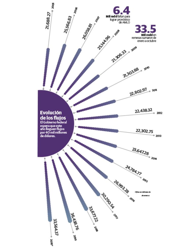 Cifras del Banco de México (Banxico) muestran que entre noviembre y diciembre de 2019 se recibieron seis mil 044.08 millones de dólares, cifra cercana a los seis mil 435.62 millones de dólares que hacen falta para llegar al pronóstico de remesas del Gobierno en este año.