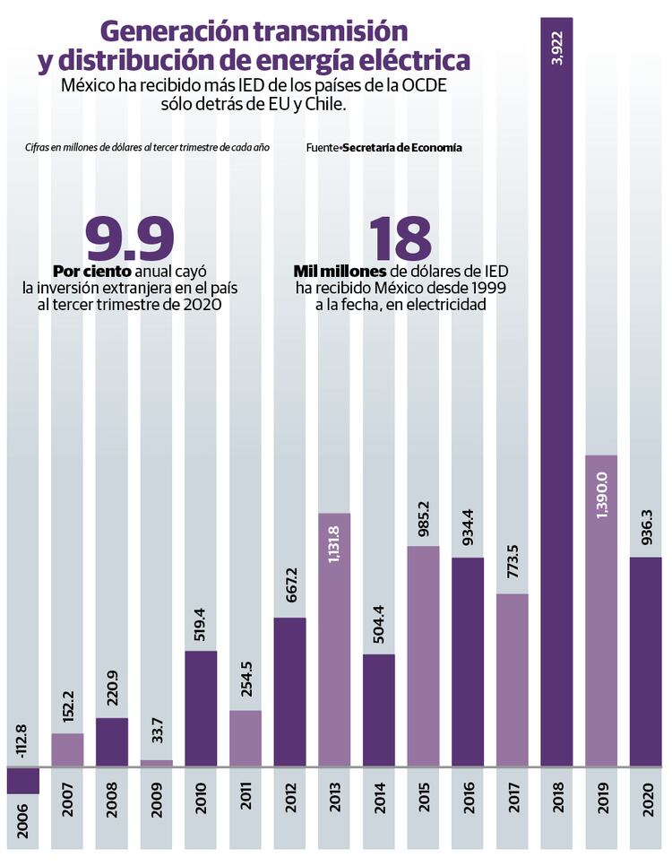 De acuerdo con datos de la OCDE, México recibió 13 mil 632.512 millones de dólares en IED, por concepto de electricidad y gas, entre los años 2013 y 2019.