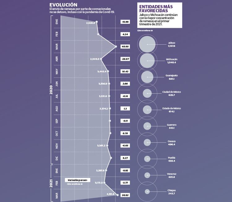 Con las remesas captadas en marzo se impuso un nuevo récord histórico, ya que se superó los cuatro mil 044.8 millones de dólares que se captaron en el tercer mes de 2020, cuando anotó un nivel no antes visto, pese a la pandemia de Covid-19; sin embargo, el alza de 2021 sigue estando por debajo del obtenido el año pasado, de 48.4 por ciento respecto a febrero.