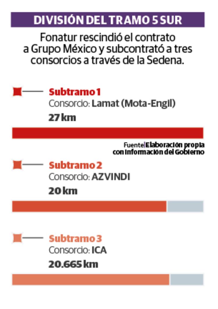 El Tramo 5 sur es uno de los segmentos de la obra insignia del Gobierno federal que más dificultades ha presentado. Apenas se hizo oficial que Fonatur dio por terminado, de manera anticipada, el contrato con el consorcio liderado por la empresa Grupo México que construía este tramo y decidió reasignarla vía la Secretaría de la Defensa Nacional (Sedena) a otras firmas.