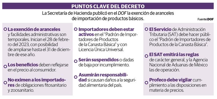 El Gobierno amplió su estrategia para estabilizar la inflación, por lo que publicó un decreto en el Diario Oficial de la Federación (Dof) en el que se exenta el pago de arancel de importación y se otorgan facilidades administrativas a diversas mercancías de la canasta básica e insumos; sin embargo, éstas ya no serán sólo a las 15 empresas con las que se signó el Apecic a principios de mes, sino que se amplió a toda persona física y empresa.