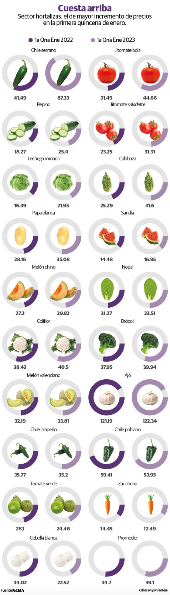 GCMA añadió que durante la primera quincena de este mes el precio de la canasta básica aumentó 17.7 por ciento; el sector de hortalizas 12.7 por ciento, el de granos y abarrotes 12.2 por ciento, el pecuario 8.1 por ciento y el de frutas fue el único que retrocedió 5.9 por ciento.