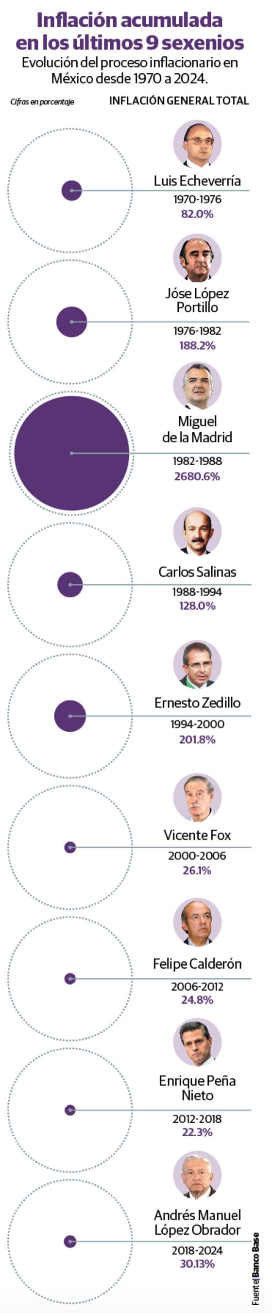 Esta cifra también es mayor en comparación con su predecesor Enrique Peña Nieto, ya que durante la pasada administración, la inflación general total fue de 22.2 por ciento; mientras que con Felipe Calderón Hinojosa alcanzó 24.8 por ciento y con Vicente Fox Quesada llegó a 26.1 por ciento.
