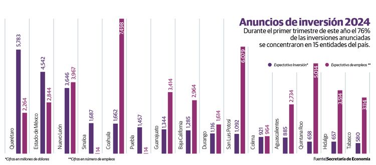 Ante esto, la SE destacó que las principales entidades federativas que mayor inversión podrían recibir, son Querétaro, con 16 por ciento; Estado de México, con 13 por ciento; Nuevo León, con 10 por ciento; Sinaloa, con 5.0 por ciento y Coahuila, con 4.0 por ciento.