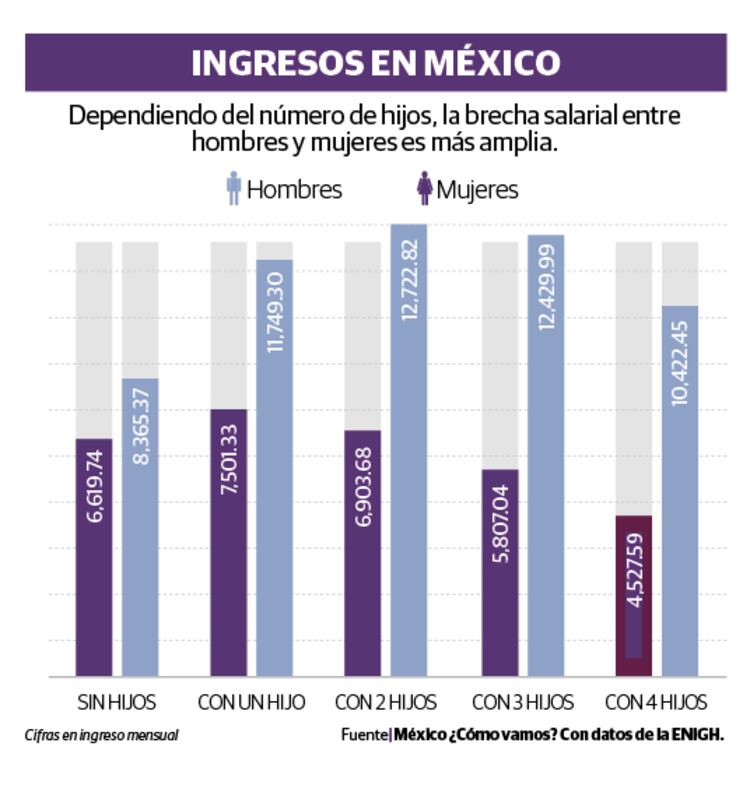 Para las mujeres mexicanas tener los mismos ingresos salariales que los hombres representa un gran reto y éste se va complicando aún más cuando tienen hijos, pues la brecha salarial es de 56.6 por ciento; es decir, aún mayor que para personas sin hijos.