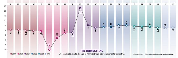 Durante el segundo trimestre del año, el Producto Interno Bruto (PIB) registró apenas un crecimiento de 0.2 por ciento, en términos reales, con respecto al trimestre inmediato anterior, mientras que en su comparación anual se expandió a 2.2 por ciento, una desaceleración si se equipara con el mismo periodo de 2023, cuando la economía creció 3.5 por ciento.