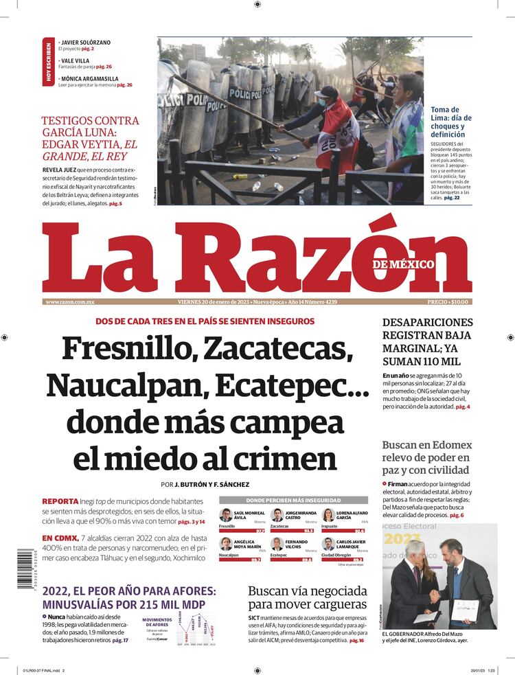 PRIMERA PLANADos de cada tres en el país se sienten inseguros Altas tasas e inflación Reprochan la falta de atención Actos vandálicos caracterizan “toma de Lima” Definen jurado Nada por la fuerza, todo por la razón y el derecho: AMLO Elecciones 2023